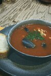 Томатный бульон с голубыми мидиями, кальмаром, осьминогом и креветками. Подается с хлебом собственного приготовления и петрушкой.