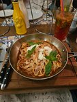 Интерьер просто замечательный! Но по пасте казарече с говядиной и горчичным соусом могу сказать, что не хватило соли, я самостоятельно довел до вкуса, но вот говядина достаточно жестковата, возможно тяжело приготовить иначе, но пасте дал бы 3/5. К пицце вопросов нет, она идеальна 5/5 Лимонад интересный, брал базилик! Хороший баланс сладкого и кислого.