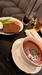 невероятно вкусный борщ, дружелюбный персонал и веселая, беззаботная атмосфера. официанты поддержат и посоветуют если гость сомневается, пошутят. очень советую к посещению это место! в минске проездом