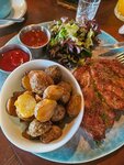 Кухня не очень вкусная. Дополню отзыв, колбаски которые нам принесли были явно приготовлены ранее и просто разогреты в микроволновке, снаружи они были горячие, а внутри холодные. Так обычно бывает когда разогреваешь в микроволновке, соответственно и вкус этих соответствующий.