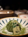 Гёдза с острой начинкой из креветки, чили и свежего цукини, приготовленные традиционным способом. Подаются с соусом чимичурри и со сливочным соусом на основе соевого соуса, сливок и карамелизированного лука
