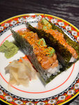 Лосось выкладывается на рис, который заправлен двумя видами рисового уксуса, и подаётся с имбирём и васаби. Рекомендуем есть без соевого соуса