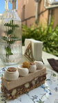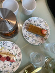Абсолютно обыкновенная еда. Цезарь с листьями салата непонятной свежести. Яйцо пашот оказалось яйцом сваренным вкрутую, недопустимо для такой цены и места. Десерты вкусные, но сверху были заветренные, бумажная эмблема вместо съедобной. Десерты принесли раньше горячих блюд, приборов не дождаться, тарелки просто ставят молча, потом не уносят. Какая-то проблема с меню: части десертов нет, часть называются по-другому, у части другой состав. Грязные салфетки.