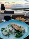 Красивое место, рядом шикарный пляж с мелким песком и качелями в воде. Есть б/пл деревянные лежаки. Очень мелко, для детей. Номера вполне приличные, дачного типа, тв, холодильник, набор посуды, тарелки, чашки, стопки, штопор, набор полотенец, туалетные принадлежности. Кондиционера нет, окна с москитными сетками. У каждого номера свой мангал, кочерга. Ресторан вполне приличный. Прокат лодок, сапов, яхт, велосипедов.