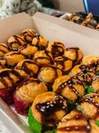 Запеченный Калифорникейшн, запеченный Розовая пантера, запеченный острый с креветкой, запеченный Чикен Чиз, запеченный Гранд с Крабом. Подается с соевым соусом (30 г), имбирём (30 г), васаби (10 г)