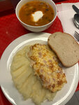 Салат из моркови с сыром, Борщ с курицей и сметаной, Рубленая куриная котлета с овощами с картофельным пюре, напиток на выбор: компот, чай