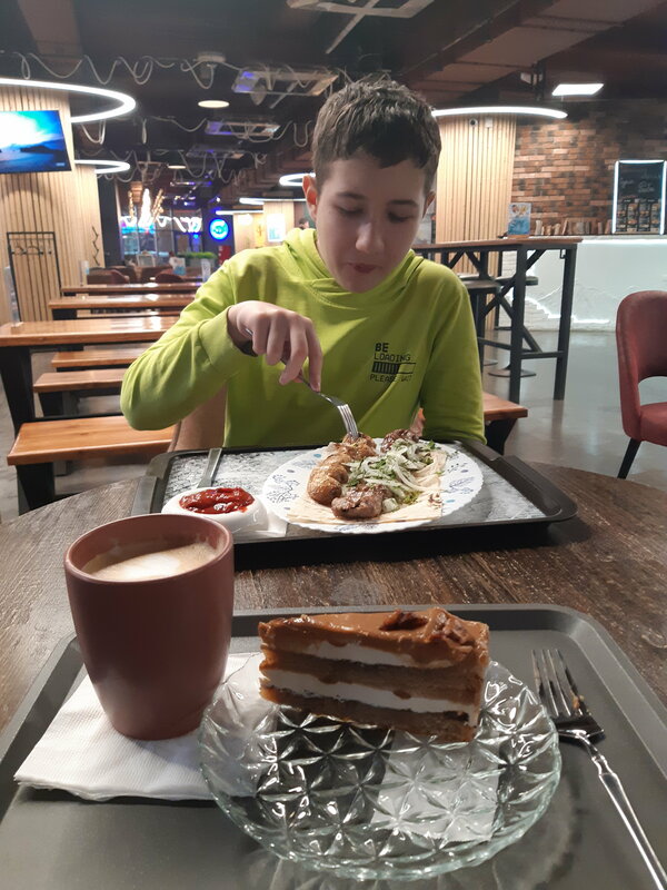 Неплохо...просторное помещение,рассчитаное на большое количество посетителей. Есть столики на возвышении у окон. Есть столики на улице. В тёплую погоду - самое то... Представлено несколько кафе с различной тематикой..мы остановились на любимой кавказской кухне...)) блюда выбрали,которые готовятся на мангале...вкусно... Я взяла себе чашку кофе и кусочек торта с грецкими орехами ...всё прилично.. Цены московские. Заведение,в целом,понравилось..спасибо