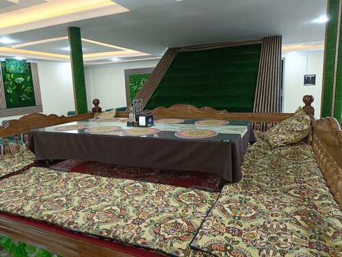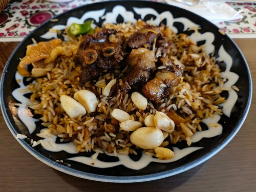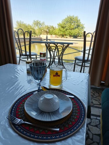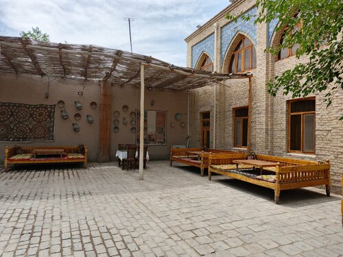 Неподалеку от западных ворот, вкусно, живописно, пробовали Хивинский плов, обычно готов к 13:00 не ранее, можно выбрать стол в помещении или дастархан в саду. Можно взять халат и папаху, сделать фото. Официанты вежливые