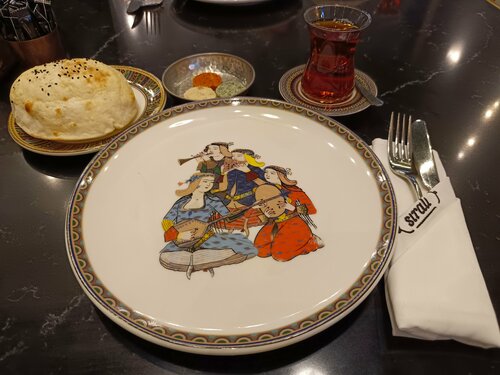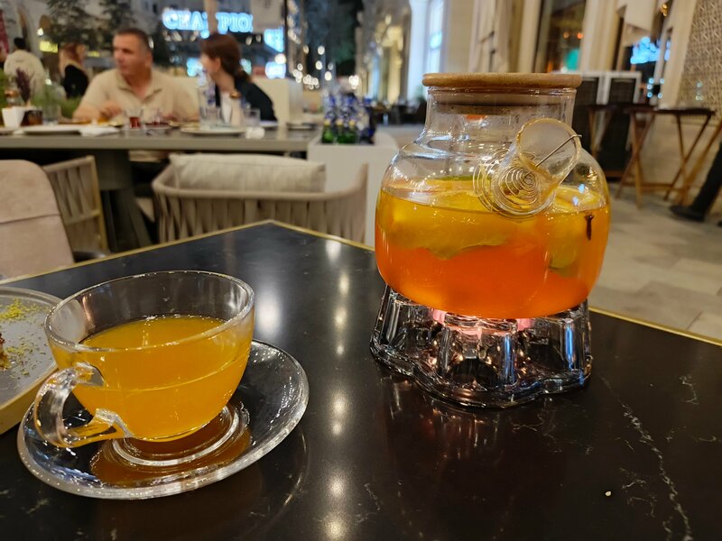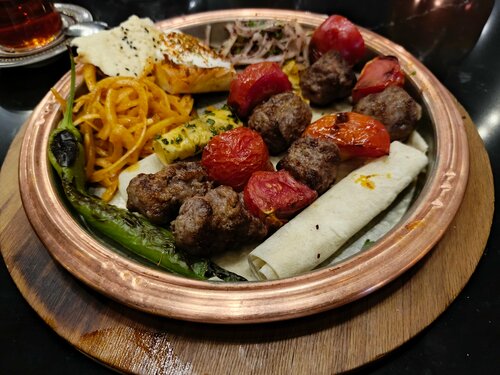 Удобные столики и кресла, грамотные и вежливые официанты, разнообразное меню, красивая подача, ждать не долго, порция не огромная, но приличная (брали кебаб), вкусный чай фруктовый большом чайнике, после приема заказа сразу принесли комплимент: два бардака с чаем турецким и два пиде. Цена выше средней, но того стоит, рядом фонтан , в 21:00 небольшое ЦМ шоу на 10 минут, рекомендую