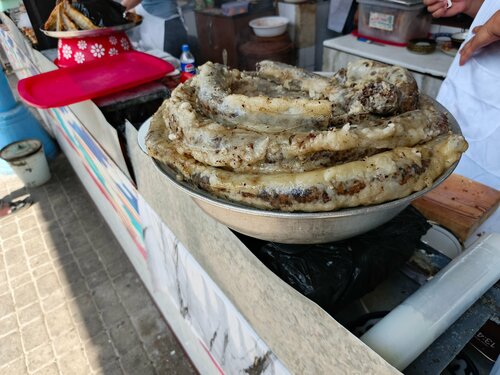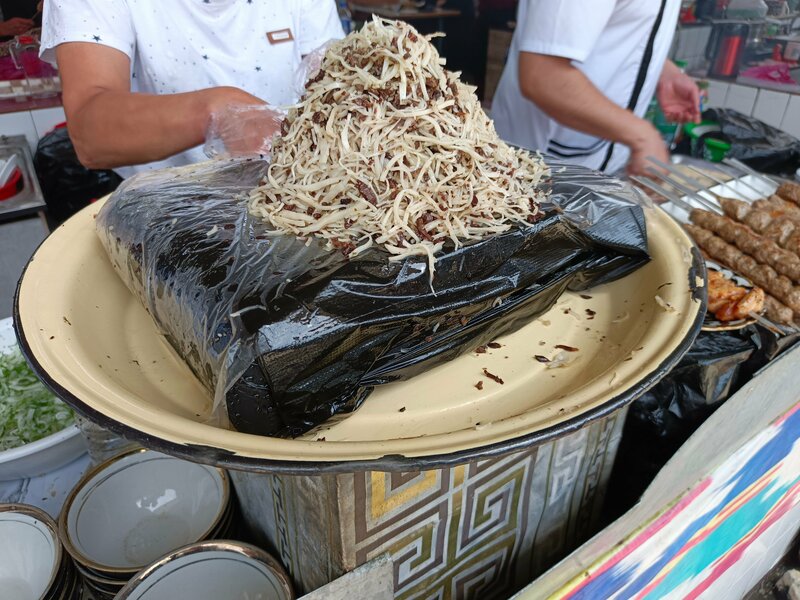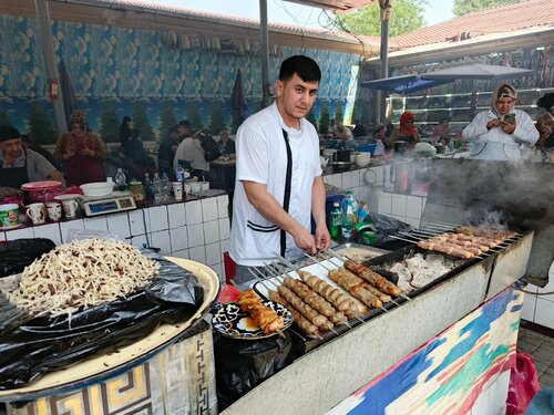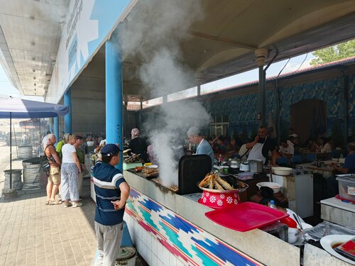 В 2 ряда готовят шашлыки, кебаб по 20, норын(лапша с кониной) по 40 и еще что-то, на месте есть не стали, взяли в контейнере с собой, народ лопает тут же за столиком, колоритно, необычно, еда вкусная, разок стоит посетить для галочки