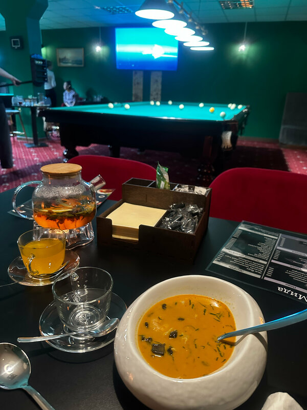 Все понравилось , особенно после того как обыграла 3/0 😁 Обслуживание на высоком уровне , периодически хозяин заведения спрашивал как у нас дела, все ли нравится, то есть ему важна его репутация, это важно . Уютные диваны , еда свежая , чай понравился , не на сиропе . В конце также хозяин заведения подарил пирожное на выбор , было очень приятно ! Однозначно рекомендую и по возможности еще вернусь !