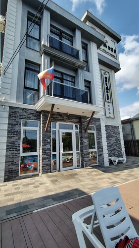Отдыхали в начале сентября. Номер 4местный с террасой. Плюсы: в номере чисто , регулярно убирают,есть лифт, на террасе есть сушка для белья, в холле стоит кулер с водой, можно отдельно купить завтрак/обед/ ужин за 450₽ ( вкусная домашняя еда) , красивая столовая на цокольном этаже с игровой зоной, большой бассейн ( не подогревался) с детской зоной, до моря 5 мин пешком(в море сначала галька, потом песок), отличная набережная без магазинов,кафе и толп людей, вежливый персонал. Есть мини магазины в пешей доступности и детская площадка. Нам понравился отдых! Минусы: одна розетка на номер для 4х 😱, и вторая в ванной, нет ворот ( заходи ,кто хочет), деревянный пол у бассейна сломан ( детям опасно ходить) были неделю и никто его не починил, маленькая парковка у отеля, на террасе нет освещения вообще ( сидели вечером в полной темноте), нет навеса и разделения между другим номером, в холле нет дивана , в номере нет стула у столика, в номере нет чайника ( только 3 стакана). Это всё мелочи, но их можно легко исправить, надеюсь, руководство решит эти проблемы в скором времени! Потенциал у отеля хороший, вернулись бы ещё!