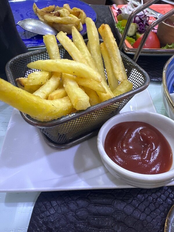 Картошка что фри что деревенская приготовлена с приправой ролтон которая бьет а нос и из за этого картошка очень очень соленая ее невозможно кушать…официанта приходилось звать по 10 раз причем подходили 3 разных человека что тоже не очень оставляет впечатления. В целом еда нормальная, но дороговата для такого качества