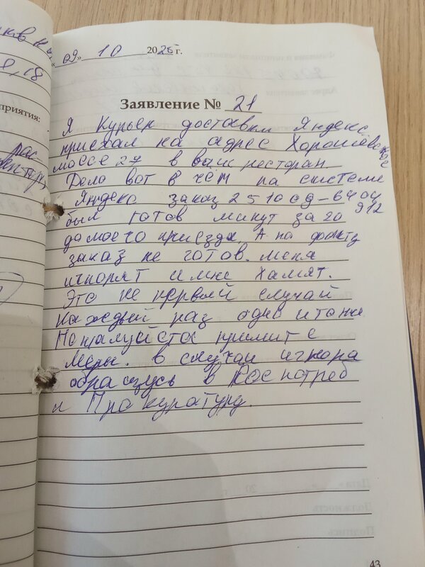 Самый ужасный уровень обслуживания. Я курьер сервиса доставки Яндекс. Ждал на адресе более 30 минут хоть мой заказ уже давно был готов по системе. Примите меры к данному филиалу ресторана Вкусно и точка.