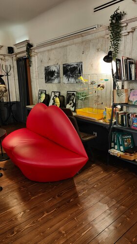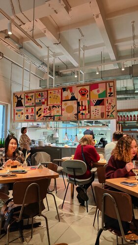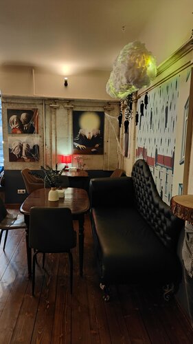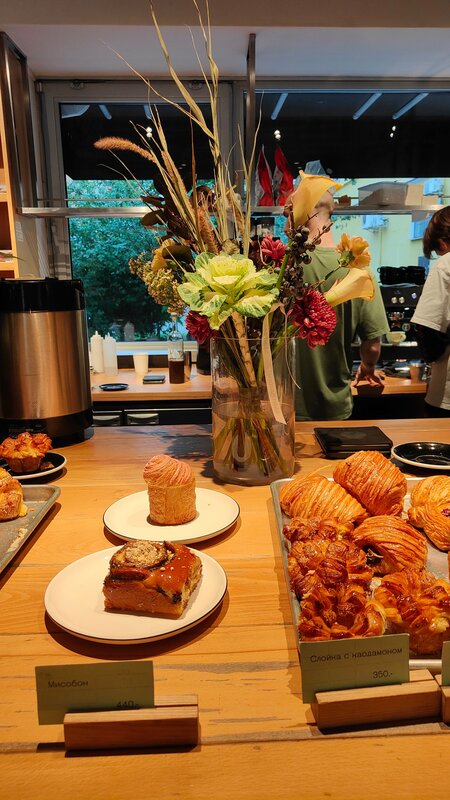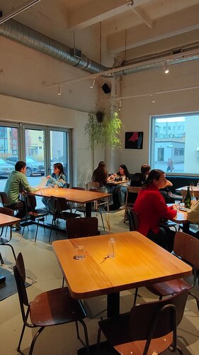 🧐🗣 Тут, похоже, много студентов - может быть, рядом есть учебные заведения? 🙂🗣 В кафе стоит гул, все сидят и болтают - очень оживленно. По задумке, после посещения галереи я рассчитывал найти здесь один интересный десерт, но, как оказалось, его продают в другом месте. Ощущения от посещения кафе - здесь легко и непринуждённо. Опять же, водичку бесплатно наливают - хорошая особенность. Хотелось бы, конечно, чтобы это было повсеместной нормой, но, возможно, мы постепенно к этому придем. 🐕 Для меня все ещё странно видеть, как собака сидит за столом на стуле - что-то внутри подсказывает, что ее место на улице. Видимо, мои исторические представления, воспринимающие собаку только с функциональной роли, не успевают за современными взглядами, где она становится компаньоном, с которым разделяют трапезу.