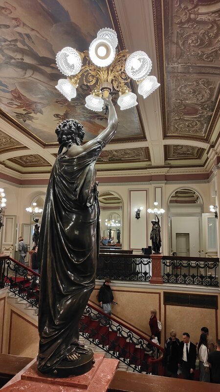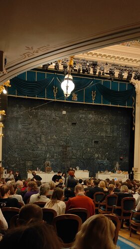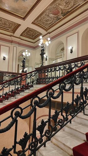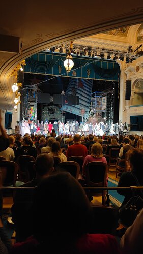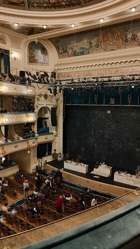Когда впервые посещаешь новый театр, это всегда какое-то открытие: как он выглядит изнутри, где самая большая люстра, а где часы в зрительном зале, есть ли у них музей и удобны ли кресла. В музее театра можно задержаться, изучая  кабинет директора, актерский состав прошлых лет и макеты декораций. 🎭Три толстяка. Эпизод 1. Восстание. Сказка-антиутопия (трилогия) начинается с захламленной лаборатории с огромной во всю сцену доской и примитивных шуток про носки. Профессор Гаспар обращается к залу как к студентам, используя соответствующие реплики и плоские шуточки. Возникло чувство интеллектуального оскорбления - со мной разговаривают на уровне клише и дешёвых штампов, будто я не способен оценить более тонкую игру. 🧐🗣 Может, они специально взращивают в тебе эти ощущения? 🙂🗣 В зале были слышны смешки и хихиканье. Возникло чувство испанского стыда: неужели то, что я считаю плоским и фальшивым, кого-то искренне смешит? Мы смотрим один и тот же спектакль? Почему я краснею из-за этой ситуации? 👨‍🔬 Но тут началось представление: ученый Гаспар, как паук, начал ползать по своей доске (на тросе), рассказывая историю и подсвечивая (в прямом смысле - элементы начинали светиться) факты и формулы - очень эффектно. 🏰 Розовые дамы, представляющие светлую силу, открывают глаза нашему научному герою на реальность, чтобы помочь в его миссии - спасти мир от темной энергии Т-3. В этот момент доска лаборатории превращается в средневековую башню, подвергающуюся осаде: открываются ворота, оттуда выбегают стражники, кто-то падает из окна, происходит восстание. Все это сопровождается диалогами и историей, которые я практически не воспринимаю, поскольку происходящее на сцене настолько меня поглотило, что я только и думаю: "Ничего себе, как же они все круто так сделали!" ☄ Ещё один момент - и стены башни рушатся, огромные блоки падают на сцену. Сквозь стену на сцену выезжает огромная пушка, развеваются красные флаги и видны огромные красные звёзды, звучит музыка, происходит сражение, слышны выстрелы. - Да что вы такое творите черт возьми - как же это круто! Непередаваемые эмоции - вау-эффект в кубе обеспечен. Ярко, сочно и красочно. Потрясающая работа со сценой и декорациями - ничего подобного не видел. Это настолько захватывающе, объемно и грандиозно, что трудно передать словами! 👩‍🎤 Классно проработанные персонажи - движения, поведение, образы. Сейчас пришла мысль, что я такого почти не встречал в нашем кино, а тут на сцене устроили такое шоу в реальном времени - очень круто. Что касается истории и глубоких смыслов, - тут все меркнет и становится малозначимым на фоне красивой картинки. Может, так и задумано, а может, это только я так понял? Посмотрим, что будет во второй части 🙂