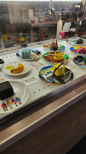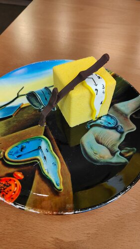 🤨🗣 У тебя там что, современным искусством намазано? 🙂🗣 Ну да, есть немного. Но согласись, это ведь интереснее, чем брауни или наполеон. 🤨🗣 Сегодня утром Сальвадор Дали создал этот десерт специально для тебя, чтобы ты прочувствовал невероятный вкус творчества и страсти великого мастера, чтобы ты пришел и ощутил те же эмоции, что и он, когда создавал свои шедевры. А когда ты выйдешь в реальный мир, вдохновленный новым опытом, ты пойдешь творить и создавать свои собственные произведения! Ты ведь этого хочешь? 🙂🗣 Да, да. Именно так. Я готов!  🤨🗣 Или ты хочешь показать свою "крутость"? Типа все медовик уплетают, а ты, вон смотри, "постоянство памяти" вилкой ковыряешь -  выпендриваешься, поди, а? Фоточки будешь везде выкладывать? 🕟 Хрум-хрум 🙂🗣 Вкус довольно обычный 💭 Краска на посуде, на которой подаются десерты, частично слезла, что явно портит впечатление, а рисунок отвлекает внимание от главного действующего лица. Было бы круто, если бы вместе с десертом подавался маленький мольберт с карточкой, на которой была бы изображена картина, послужившая вдохновением для десерта, краткая информация о ней и о кафе. Посетители, возможно, забирали бы домой такие карточки-сувениры, и у них было бы напоминание об этом месте.