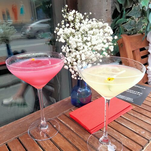 Коктейли здесь потрясающие! Никогда ещё такие вкусные не пила. Брали 4 разных. Официанты помогли выбрать, то , что было из еды было вкусно. Не дёшево. Ради коктейлей рекомендую сюда приехать. Была здесь летом и погода позволяла посидеть на улице. Нужно отметить, что столики прямо на тротуаре и очень близко ходят люди. Можно спуститься в зал , там прекрасная атмосфера.