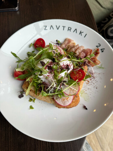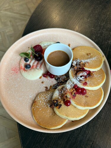 Утренний субботний завтрак, прекрасное места встретится с друзьями и пообщаться. Вкусное яйцо пашет с беконом, много зелени, морковные тосты были твердые и не очень вкусные, бекон вкусный, не хрустел только вкусный Были панкейки с соленой карамелью, было очень вкусно не очень сладко, единственное это гранола, она было твердой, только вкусной Официант душка 🫰🤌 Понравилось , лайк подписка вернусь