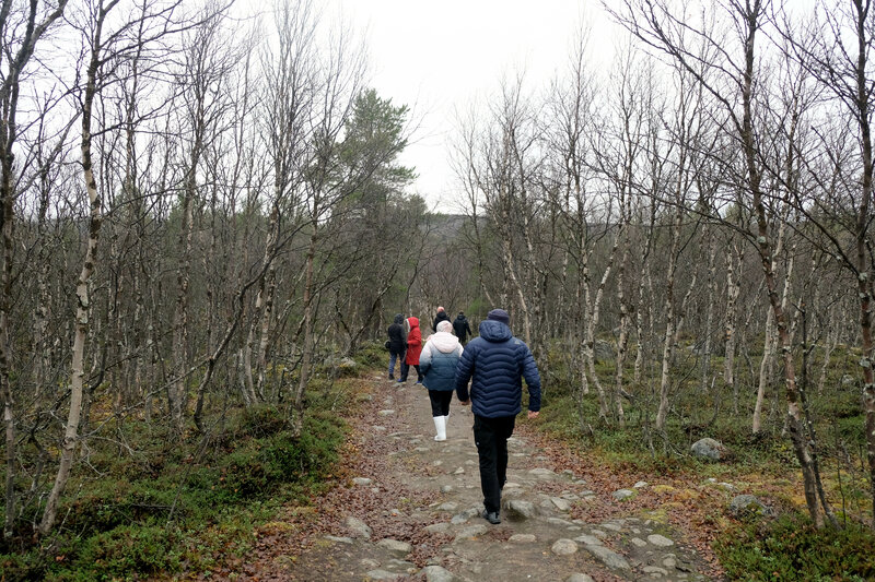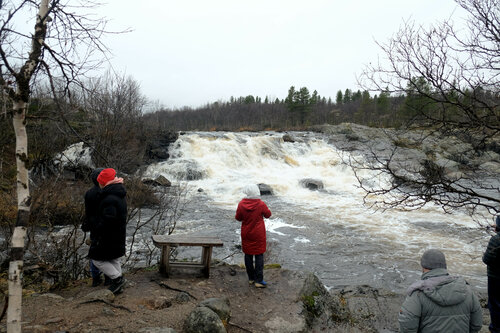 Это действительно больше не водопад, а порог, но выглядит всё равно красиво. От трассы нужно пройти по хорошей тропе через берёзовую рощу. Тропа красивая. Особенно красиво осенью.