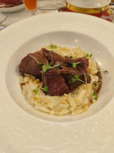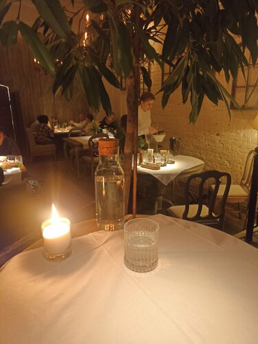 Шла сюда целенаправленно. Ещё перед Новым годом, купив тур в Калининград, начала выбирать ресторан. Мои поездки, вообще, это гастротур с вкраплениями культуры и искусства. Короче, два дня выбирала ресторан для главного вечера поездки и выбрала из 10 рекомендованных всякими сайтами именно этот. И не прогадала! Честно признаюсь, увидев в меню говяжьи хвосты, загорелась их попробовать, потому и заказала столик. Начнём с интерьера. Историческое здание, одно из немногих сохранившихся после взятия Кёнигсберга. Два небольших зала примерно на 12 столов. Приглушенное освещение и свечи на столе создают идеальную атмосферу. Особенно под джаз, который здесь абсолютно в тему. Теперь по кухне. Помимо тех самых хвостов взяла сезонный салат с балтийской килькой и рубанину из трески. По поводу салата скажу то же, что сказала своей официантке Владе: "Даже для любителей рыбы очень специфическое блюдо. Килька слабой соли с салате - это смело". Короче, салат на любителя, причём довольно редкого. Я ещё тот кулинарный извращенец, но всю тарелку не осилила. Рубанина нежная, как и положено мороженой и подтаивающей рыбе. Как закуска - самое то. Треска - рыба не самая жирная, поэтому сильно на аппетите не скажется. Ну, и финалом - говяжьи хвосты. Начнём с того, что жадность и отсутствие обеда в сочетании с долгой прогулкой по городу сыграли роль, пришла в ресторан очень голодная, поэтому не рассчитала свои силы. Да и порции здесь немаленькие. В общем, думала, хвосты не осилю. Но не тут-то было! Более нежной говядины я ещё не ела! Это просто божественно! Ещё вкуснее щёчек, которые я ела в Петрозаводске в ресторане Телеграф. Мои восторги шефу Штейндамма! Отдельно про стафф. Идеально. Официанты отлично знают меню, легко назовут вам все ингридиенты, расскажут, как надо это блюдо есть. И вообще, милые улыбчивые девочки. Но без чрезмерной назойливости, что особенно радует. Общее ощущение 10/10. Кстати, в праздники, если собираетесь в Калининграде посетить этот ресторан, бронируйте стол сильно заранее. Я тут подслушала, что ближайшая бронь только на 9 января. Администратор зала постоянно на телефоне, ресторан очень популярный. И это не случайность. В общем, я влюбилась в это место и его кухню.