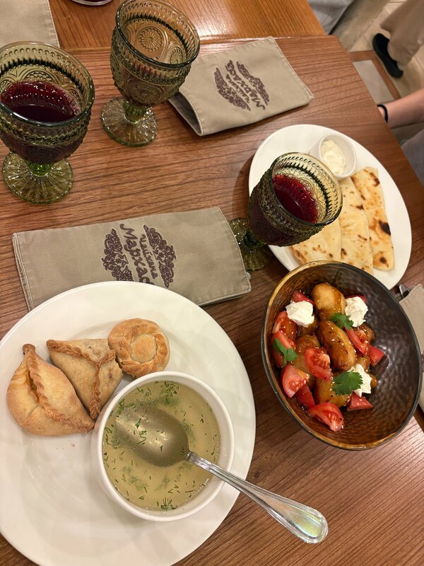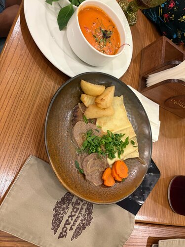 Обедали в данном ресторане,нам понравилось,все блюда были вкусные и достаточно сытно ,посадка была небольшая,нас было 8 человек,принесли заказ очень быстро,есть национальные костюмы в которых можно сфотографироваться,чисто,уютно,алкоголя нет,так как кафе халяльное!Рекомендуем