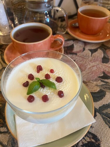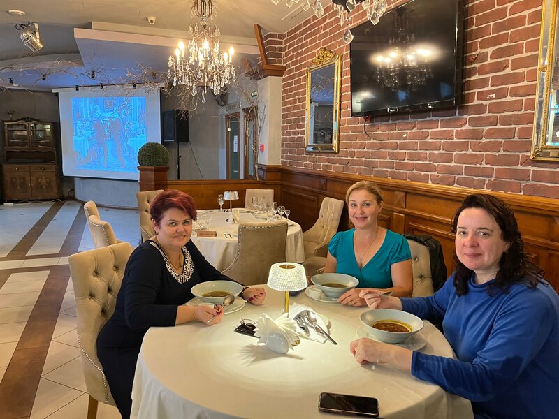 Ресторан неожиданно очень понравился! Неожиданно, наверное, потому, что вход в него в цокольном этаже, а так чаще всего устраивают бары и подобные заведения. Но нам повезло! Дождь лил как из ведра, и мы решили не искать других мест, чтобы пообедать, и спустились по лестнице. Просторное фойе, где можно оставить посушиться зонт и промокшие плащи; чистые туалетные комнаты с хорошим мылом; зал большой, но при этом очень уютный. Можно и группу туристов накормить, и юбилей отметить, и небольшой компанией пообедать после долгой прогулки по паркам и дворцам Петергофа. Официанты и администратор очень любезные, искренне приветливые, обслуживают быстро и корректно, не стесняются записывать заказ (теперь это почему-то не принято во многих местах), поэтому приносят всё, ничего не забывая и не путая. Мы втроем отлично провели время, с удовольствием поели, отдохнули перед обратной дорогой и сошлись на том, что обязательно будем обедать здесь, приезжая на новые экскурсии. Посмотрели даже на сайте номера в гостинице, расположенной в верхних этажах. Выглядит очень уютно и стоит недорого, притом что находится отель через дорогу от Верхнего сада и Большого дворца. Очень рекомендую гостям города, и вот почему: за один день Петергоф осмотреть не удастся, стоит уделить ему пару- тройку дней, чтобы и дворцы с павильонами осмотреть, и в парках (их несколько!) спокойно, с толком прогуляться пешком и на маленьких экскурсионных паровозиках. Чтобы увидеть сам город с вокзалом Бенуа, с Петропавловским собором и Ольгиным прудом. В Петербург совсем не трудно добраться как на общественном транспорте, так и на машине. Можно вообще за тридцать минут домчаться по заливу на метеоре прямо к Эрмитажу, если необходимо, правда, придётся заплатить за вход в парк, где находится пристань. Уже хочу снова сюда вернуться! Спасибо за уютную атмосферу и вкусную еду! Суп из свежих лесных грибов ( сейчас как раз сезон!) и солянка просто выше всяких похвал! Десерты ( мороженое и эклер) тоже очень хороши!