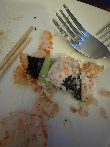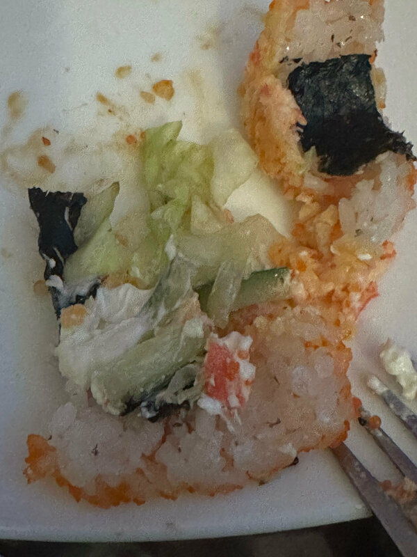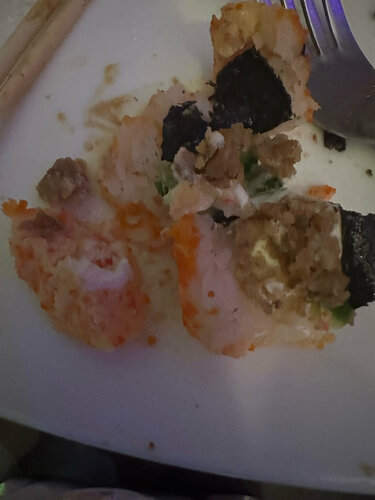 Купили два горячих набора и Вок большой. Наборы не подписанные. Некоторые суши вегетарианские,в прямом смысле. Состав в наборе совсем другой. Пекинскую капусту мы не заказывали( в место угря и креветок). Да еще и какой- то глист в придачу( фото прилагаю). Полное разнообразие. Хотели порадовать себя и близких.