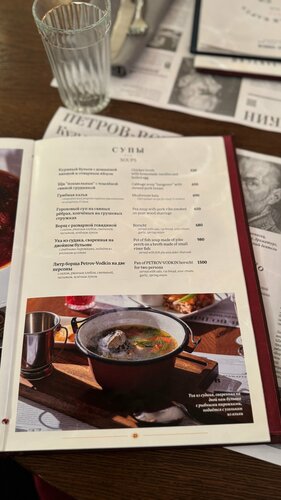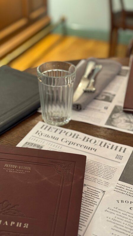 🏠 интерьер супер! Мебель, декор, репродукции художника Петрова-Водкина, посуда - всё передает дух того времени. 3 зала, Приятная атмосфера, открытая кухня, видно как готовят тапасы 👍🏻👍🏻👍🏻 🤵🏻 приятное обслуживание, красивые костюмы - так и должно быть!!! Не хочется уходить из ресторана 📕 меню прекрасное - это огромная работа шефа!!!! 🍲 всё очень вкусно, я брала борщ, тапасы, настойки. Рекомендую попробовать все тапасы - это невероятно вкусно и красиво! Борщ отличный 😌 здесь всё на высшем уровне
