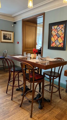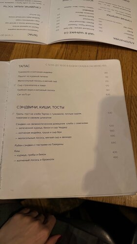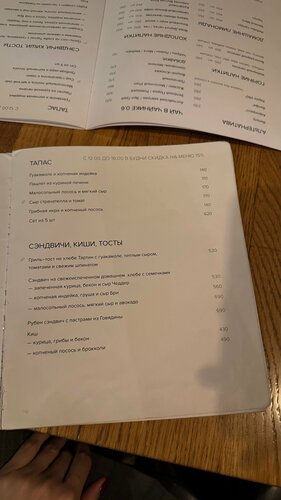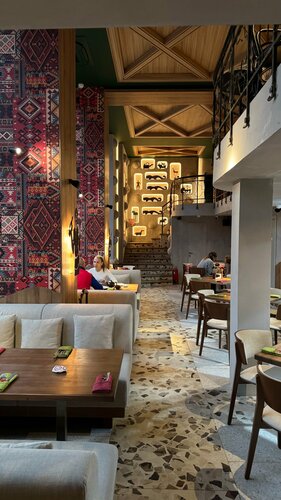 🏠 внутри классный интерьер в первом зале, зал, который находится выше уже более запущен. Столы шатаются, как за такими есть? 📕 меню обшарпанное ☕️ я брала тапасы, чай - норм Прям на 5 звезд не тянет….. 🤵🏼‍♀️ скучновато по обслуживанию….. хотя официант помогала сделать хоть что-то со столом, чтобы он не шатался 😄 не встречают, не провожают, долго несут меню