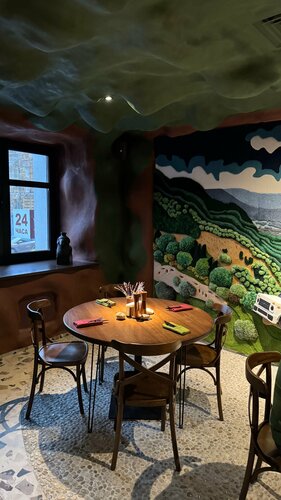 🏠 интерьер яркий, запоминающийся, хочется всё сфотографировать 📕 много интересных позиций, красивая подача коктейлей, вкусно 🤵🏼‍♀️ среднее обслуживание, к нам подсела девушка, которая рассказывала про вино собственного производства, общалась как будто мы дружим с ней 10 лет, принесла попробовать по бокалу - что это вообще было? Даже по запаху не хотелось пробовать уже … приняла у нас заказ, его включили в чек, но заказ никто нам не приносил! Остальное всё норм