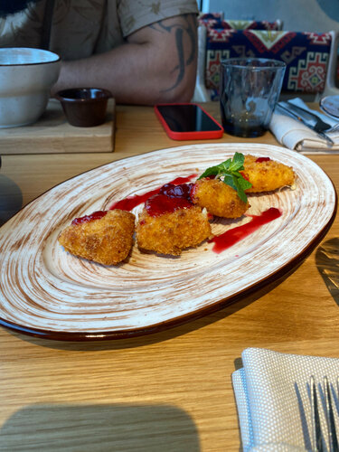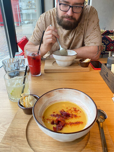 Однозначно рекомендую. Почему? Начнем с того, что очень вкусно. Хинкали по 85 рублей - обалденные. Вкусные, нежные, сочные, из тончайшего теста, которое при этом не рвется. Необычные яркие супы - очень понравится чечевичный с бастурмой. Вкуснейшие десерты - медовик тает во рту. Из минусов - ужасно невкусное пиво , да и коктейли слабоваты. Но, я так понимаю, специализация ресторана в еде. Очень приветливый и вежливый персонал. Встречают на входе, помогают снять верхнюю одежду, сопровождают к столику. Единственно, были в выходные, поток народа, желающий посетить данное заведение, был нескончаемым, и девушки на входе просто стали узким горлышком, не успевая помогать посетителям пройти внутрь, отчего образовалась небольшая пробка ). Но это, скорее, исключение. Так, однозначно оценка 5