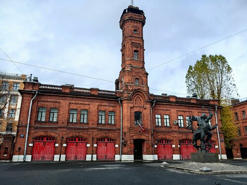 Памятник "Подвигу пожарных Ленинграда 1941 - 1945" возле не менее исторического необычного здания Василеостровской пожарной части на Большом проспекте Васильевского острова