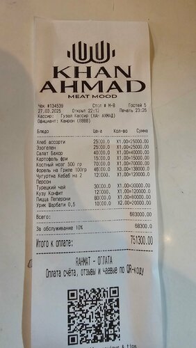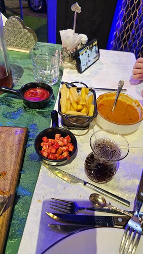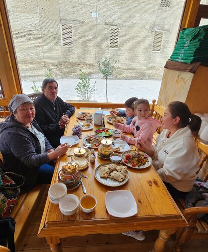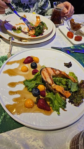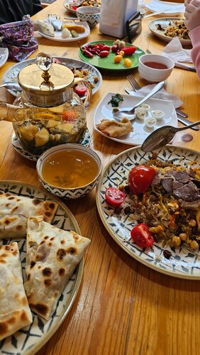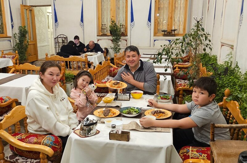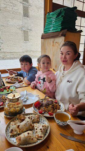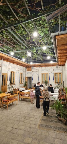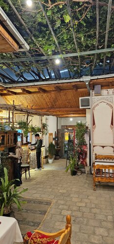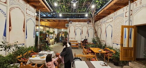 Мы гости из Алматы. 🇰🇿 Семейные, 40 лет. Относительно других ресторанов Самарканда цены выше среднего. Кухня во основном турецкая, блюда грилль, мангальные и стейки. Вечерами громкая шумная музыка. Обслуживающий персонал молодой, русский язык плохо понимают.