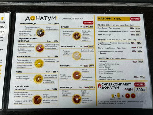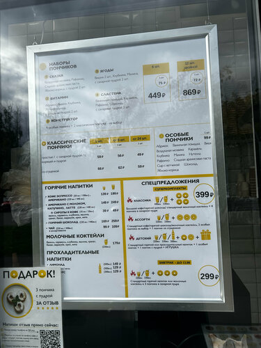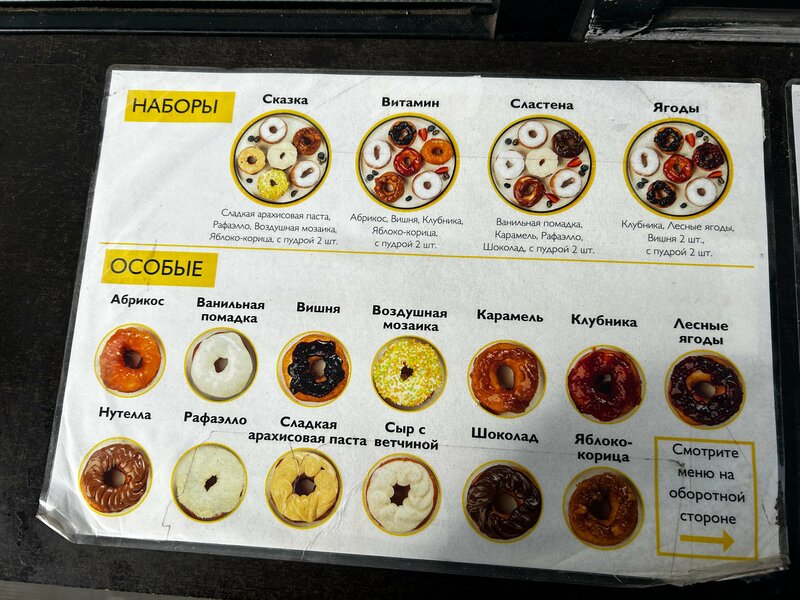 Пока только один раз удалось здесь попробовать пончики, буду еще возвращаться!! Однозначно положительное впечатление произвели. Мне очень понравились пончики с карамелью, ветчиной и сыром, лесные ягоды