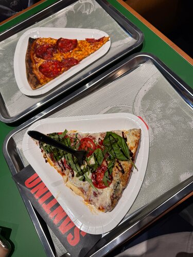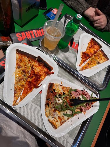 Взяли 5 разных кусков пиццы, но, честно говоря, отличий почти не было — все как один: слишком жирные, вкус сливается, ничего не запоминается. Только трюфельная хоть как-то выделялась, но и она разочаровала. Как человек, который обожает трюфель, я ожидала большего. Обслуживания по сути нет: принесли — унесли, никакого внимания, никакой атмосферы. Всё быстро, но чувствуешь себя будто в обычной забегаловке. Второй раз точно не приду.
