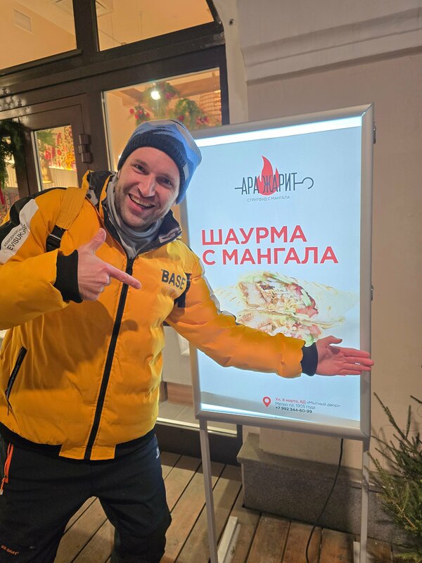 Ара Жарит))) На часах 23, Шаурмы хотим, трубы горят))) Очень оперативная подача, столы чисты, атмосфера калорита потолок европа и азия, стены восток, ковры))) Шаурма Огонь! Морс разогрели, спасибо! Респект сотрудникам! Фаст фуд с душою! Подача с перчатками. Всё полезно, что в рот пролезло "с" Парковка со стороны Банковского.