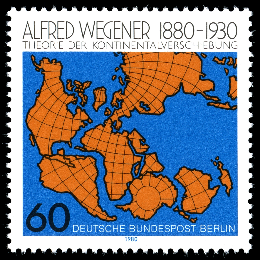 Почтовая марка, посвящённая Альфреду Вегенеру и его открытию, 1980 год. Источник: commons.wikimedia.org